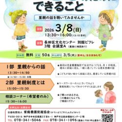 2026年2月5日 / 最終更新日時 : 2026年2月5日 ainotekobe 講座里親出前講座「今、こどものためにできること」2026/3/8(日) 神戸市里親会では、市民のみなさまに里親制度を広く知って頂くことを目的に、里親出前講座を開催しています。 今年は、3月8日(日)に長田区文化センター 別館ピプレ(JR新長田駅前)にて開催します。 家庭で親と暮らせないこども […]